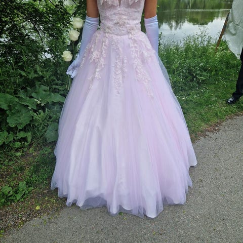 Balklänning för dam i storlek S. De är korsett snörning i ryggen så passar nog flera andra storlekar. Klänningen har färgen champagne. Modellen har en voluminös kjol och figurnära överdel. Dekorativa detaljer och struktur i tyget ger ett markerat och klätt intryck.