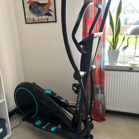 Maskinen har fotplattor med halkskydd, stabil ram och inbyggd träningsdator med display och funktionsknappar för olika träningsprogram och inställningar.