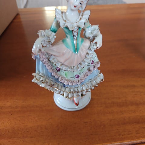 Porslinsfigur föreställande ett sittande par, dam och herre, i historiska kläder. Figuren är flerfärgad med bland annat grönt, rosa, vitt och gulddekor. Detaljerade kläder med volanger, blommotiv och guldfärgade inslag. Figuren står på en rektangulär fot med dekorerad framsida. Passar som prydnad i exempelvis vardagsrum, vitrinskåp eller samling av porslinsfigurer.