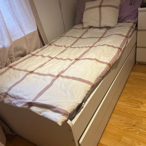 Sängen är som synes gammal och har några skavanker i färgen, men inget som påverkar funktionen. Äldre skumgummimadrass medföljer till. Ett roligt projekt för dig som gillar att fixa till, eller bara använda som den är.