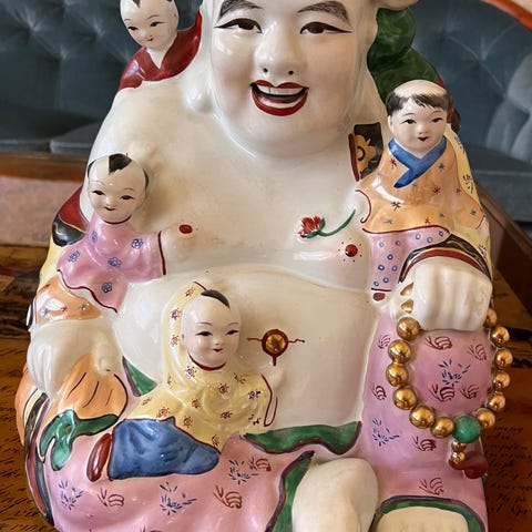 Porslinsfigur föreställande en sittande kvinna på en rosa lotusliknande bas. Figuren är huvudsakligen vit med målade guldfärgade detaljer och små inslag av grönt och andra färger. Dekorationer finns runt klädvecken och på huvudbonaden. Undersidan är ihålig med öppning. Passar som prydnadsföremål i hemmet, exempelvis på hylla, sideboard eller i vitrinskåp.