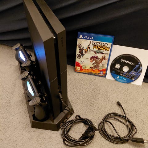 Sony Playstation 4 spelkonsol svart med tre handkontroller och spel