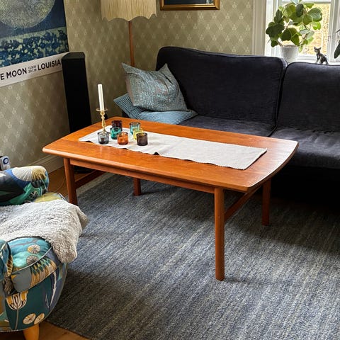 Ett fint soffbord i ek som nu ej längre kommer till användning. Bordet har en del minde märken och skulle må bra av en ny ytbehandling, antingen med bets alternativt olja.