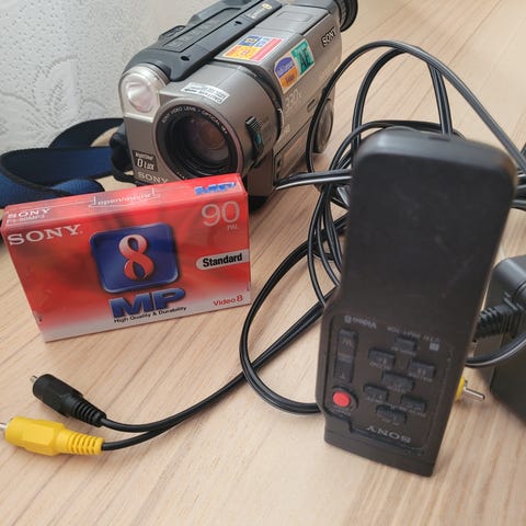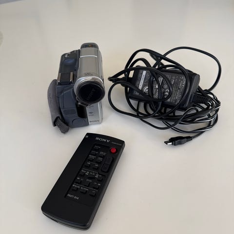 Sony DV Digital Handycam videokamera i silverfärg. Kompakt digital videokamera med utfällbar LCD-skärm och tillbehör som nätadapter, A/V-kablar och FireWire kabel. Passar för in- och uppspelning av äldre digitala DV kassett band till dator eller TV,