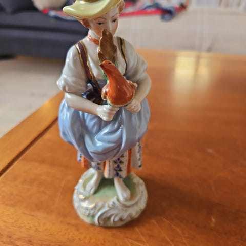 Porslinsfigur föreställande en dam med solfjäder. Figuren är klädd i lång blå klänning med ljusa och blommiga detaljer samt överdel i ljusa pastellfärger. Håret är långt och vågigt och figuren har dekorerad halsringning. Undersidan är ihålig med två öppningar. Passar som prydnad i hemmet eller samlarföremål.
