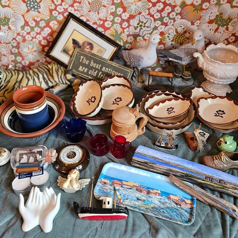 Blandat parti porslin och prydnadssaker i olika storlekar och utföranden. På bilderna syns bland annat kannor, skålar, tekannor, burkar, ljusstakar, figurer, vaser, glasföremål och dekorationsföremål. Flera delar är i blåvitt porslin, men det finns även gröna, gula och flerfärgade objekt. Passar exempelvis som köks- och serveringsporslin, dekoration i hemmet eller samlarföremål. Säljs som ett samlat parti enligt bilderna.Ifrån10kr/styck