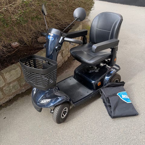 Stadig Promenadscooter Invacare Leo, som kan köras in i butiker. Två korgar - en fram och en större baktill. Laddare och överdrag följer med.