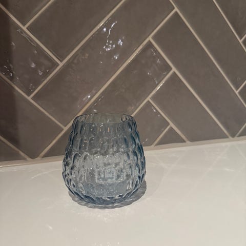 Ljuslyktan har ett bubbligt, strukturerat mönster runt om och är tillverkad i genomfärgat glas. Passar för värmeljus eller mindre blockljus och kan användas som dekoration på bord, hylla eller fönsterbräda.