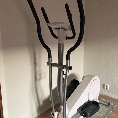 Crosstrainer i silver och svart med två handtag och fotplattor. Maskinen har ett kompakt utförande och är avsedd för konditionsträning inomhus. Passar för helkroppsträning med både arm- och benrörelser. Pedalerna är räfflade för bättre fotfäste och handtagen är klädda i skumgummi för bekvämare grepp. Inköpt från Ellos. Nypris 2999 kr.
