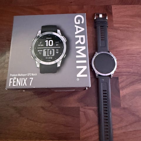 Garmin Fenix 8 smartklocka med orange silikonarmband. Klockan har rund urtavla och flera fysiska knappar runt boetten. Modellen är avsedd för träning och vardagsanvändning med GPS-funktioner och aktivitetsmätning enligt Garmins Fenix-serie. Levereras med originalförpackning enligt bild.