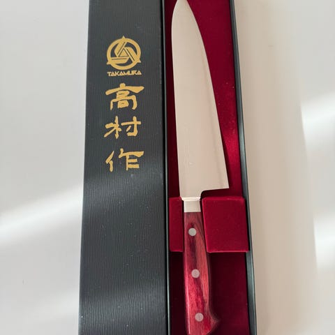 Takamura R2 Santoku 17cm.Kniven har ett mycket tunt blad som är rakbladsvasst.Stålet är högpresterande.Pulverstålet SG-2 (62-63 HRC).Kniven är aldrig använd alltså Nyskick.