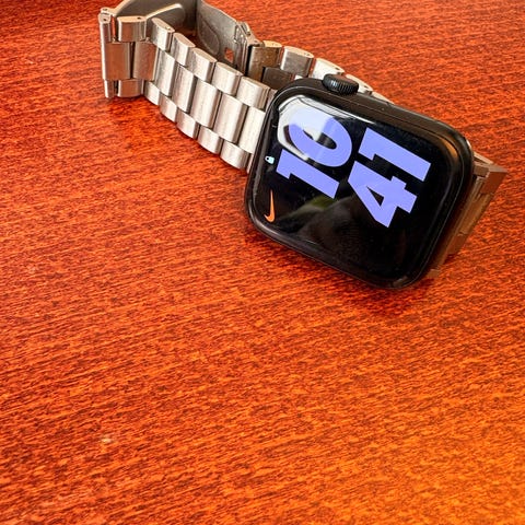 Apple Watch smartklocka (serie9) för unisexanvändning. Klockan har rektangulär pekskärm och digital krona på sidan för navigering. Visar tid, datum och notiser från ansluten iPhone samt stöd för olika tränings- och hälsofunktioner beroende på installerade appar och vald modell. Batterihälsan visas på skärmen och kan kontrolleras via inställningarna i klockan. Armbandet är i metall med länkdesign och justerbar låsning. Passar vardagsanvändning, träning och som komplement till iPhone för notiser och grundläggande appar.