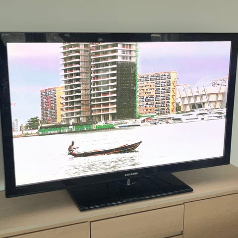 Samsung TV i svart utförande. Platt skärm som kan användas för tv-tittande, film och tv spel. Passar för placering på bänk eller väggfäste beroende på vilka tillbehör som används.