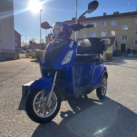 Scootern är stabil och lättkörd med tre hjul, bekväm sits med armstöd samt rymlig korg baktill för packning. Den är enkel att ladda hemma via vanligt eluttag (laddare medföljer).