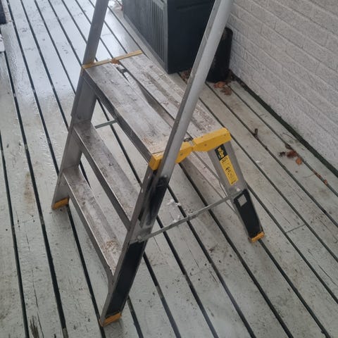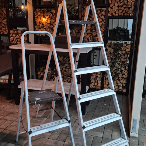 Fristående stege i aluminium med flera breda steg. Stegen är utformad som en A-stege och kan användas för arbete både inomhus och utomhus, till exempel vid målning, underhåll eller andra arbeten där extra räckhöjd behövs.