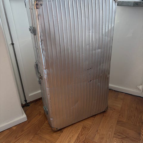 Rimowa resväska unisex i silverfärgat material. Väskan har hårt skal med räfflad utsida och förstärkta hörn. Invändigt finns spännband på båda sidor för att hålla packningen på plats. Slitage finns. Bland annat tidigare ägares namn och någon buckla, men personligen tycker jag bara det är en bra look för dessa väskor.