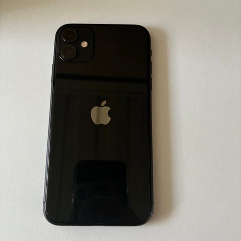 Apple iPhone 11 mobiltelefon med 64 GB intern lagring. Modellen har dubbla bakre kameror och en vit baksida. Pekskärm på framsidan och Apple‑logotyp på baksidan. Passar för användning med appar, surf, samtal, meddelanden och fotografering.