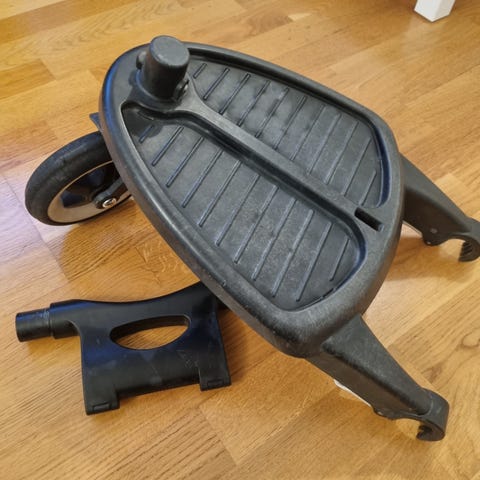 Britax ståbräda till barnvagn i svart plast. Ståbrädan monteras bakom barnvagnen så att ett större barn kan stå på den under promenaden. Utrustad med hjul och fästen för att kopplas till kompatibla Britax-barnvagnar. Passar som extra åkplats vid användning av barnvagn med yngre syskon i sitt- eller liggdel.