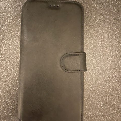 Samsung Galaxy S23 mobiltelefon med 128 GB internminne. Färg: svart. Pekskärm och trippelkamera på baksidan. Telefonen på bilderna ligger i ett plånboksfodral med kortfack, vilket visar ungefärlig storlek och utseende. Lämplig för användning med appar, surf, meddelanden, samtal och fotografering. Exakt skärmstorlek, batterikapacitet och övriga tekniska specifikationer följer standarden för Samsung Galaxy S23 med 128 GB lagring.