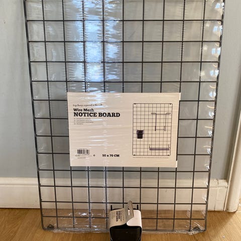 3 gallertavlor i svart metall med flera lösa tillbehör, från Biltema. Olika typer av korgar, hyllor, hållare och krokar som kan hängas på näten.