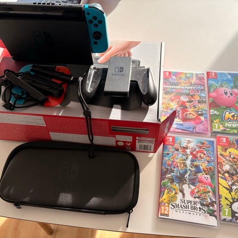 Nintendo Switch 2 I nästan helt ny skick har använt den i ca 2 veckor. Alla spel i bilden följer med samt alla tillbehör, inga repor på skärmen och skärmskydd är installerad.