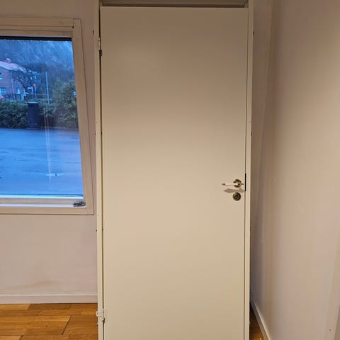 Vit innerdörr med karm och handtag. Slät dörrbladsyta i neutral vit kulör som passar i de flesta bostadsinteriörer. Utrustad med standardhandtag och låskista. Lämplig som rumsdörr, garderobsdörr eller förrådsdörr i villa eller lägenhet.