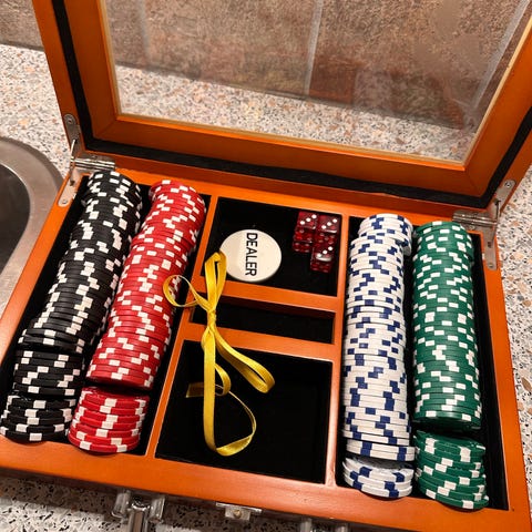Poker set i aluminiumväska med marker i flera färger samt spelkort. Setet innehåller marker i vitt, rött, blått, grönt och svart, en dealer-knapp och tärningar. Förvaras i en hård väska med handtag och skumfoder på insidan för att hålla innehållet på plats. Lämpligt för hemmabruk vid pokerspel och andra kortspel.