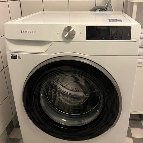 Samsung frontmatad tvättmaskin i vit färg. Maskinen har lucka framtill för påfyllning och tömning av tvätt. Passar för användning i hemmet för daglig tvätt av kläder, handdukar och andra textilier. Närmare tekniska specifikationer som kapacitet, mått och energiklass framgår inte av uppgifterna och kan kontrolleras på märkplåt eller i manual om tillgängligt