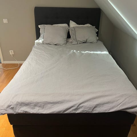 Mio säng med mörkgrå stomme och matchande sänggavel. Sängen är utrustad med vit bäddmadrass, enligt bild. Rak, hög gavel med knappliknande detaljer. Ben i mörk färg. Passar som enkelsäng i sovrum, gästrum eller tonårsrum. Exakta mått och hårdhetsgrad framgår inte av uppgifterna och kan mätas vid behov.