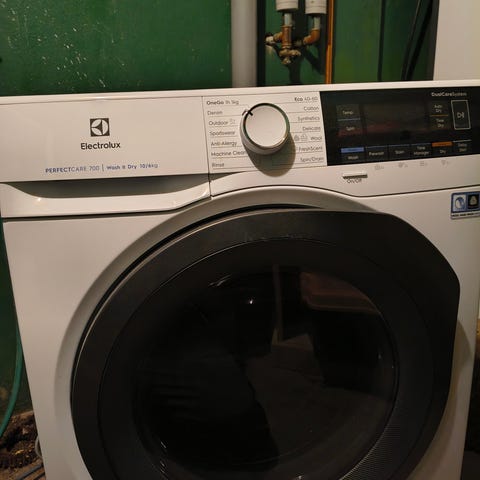 Electrolux frontmatad tvättmaskin i vit färg. Maskinen har frontlucka med glasfönster och överskåp med vred och knappar för programval samt digital display. Passar för installation i badrum, tvättstuga eller annat utrymme med avlopp och vattenanslutning. Lämplig för normal hushållstvätt av kläder, handdukar och sängkläder. Exakta mått, kapacitet och modellbeteckning framgår inte av uppgifterna och kan kontrolleras på maskinens märkplåt eller manual.