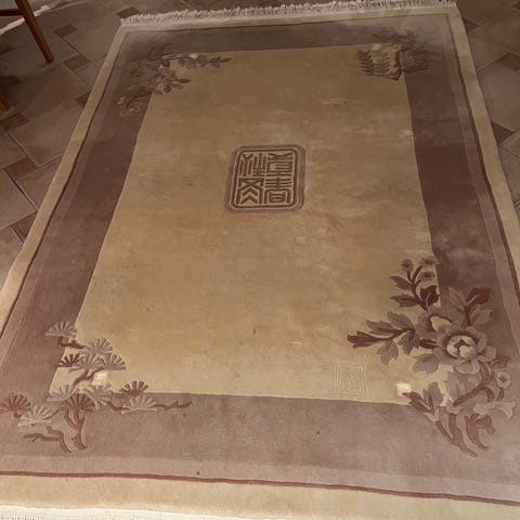 Den är använd, har tydliga spår av användning, fransar på den ena sidan är slitna. Mattan är väldigt tung (2 pers). Den har några fläckar. Den är lätt beige, med mönster, men passar till de mesta inredningarna.