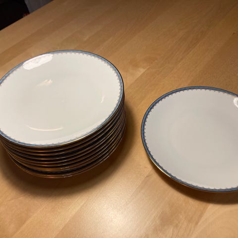 Rörstrand tallrikar i porslin med blått motiv. Tallrikarna har rund form och dekorativt mönster på ovansidan, undersidan är vit med Rörstrand-stämpel. Passar som mattallrikar eller serveringsfat i kök och matsal samt som samlarobjekt eller dekoration.