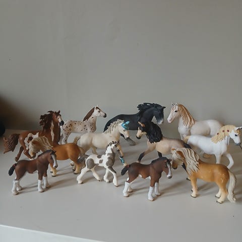 Schleich hästlekset med flera hästfigurer och tillbehör. Setet innehåller bland annat 3 större hästar , ett föl, staketdelar, hinder, en mindre blå låda samt små tillbehör och en blomsterdekoration. Passar för lek med häst- och stallmiljöer och kan kombineras med andra Schleich-figurer och -set i samma skala.