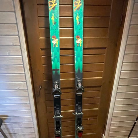Pringles skidor med bindningar i svart och flerfärgad design. Skidorna har ett brett allmountain/freestyle-inspirerat utförande med grafiskt motiv på ovansidan och enfärgad undersida. Vann dessa på ett pringles event i USA (mycket exklusiva). Går ej att hitta skidan. Nypris ca 6500kr!