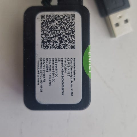 ABB OD1065 elmätare med inbyggt schukouttag. Märkdata på mätaren: 230V, 50Hz, strömområde 0,25–5(65)A, klass B, 1000 imp/kWh, 3x6. Enheten är monterad i ett blått kapslat hölje med transparent lock över displayen och ett jordat vägguttag med lock, klassat IP44. Utrustad med anslutningskabel med jordad stickpropp för mätning av energiförbrukning på ansluten utrustning via uttaget.