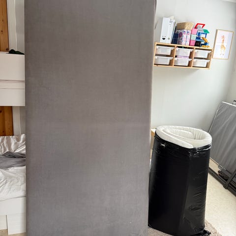 Jysk säng med resårbotten i svart tygklädsel. Sängen står på runda ben i metall och har träribbor undertill. På bilderna syns även en lös bäddmadrass ovanpå sängen. Passar som enkelsäng i sovrum, gästrum eller som extrasäng.