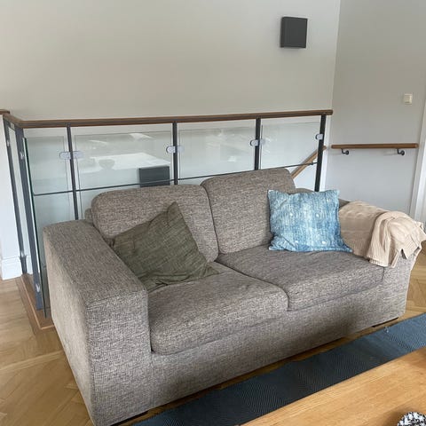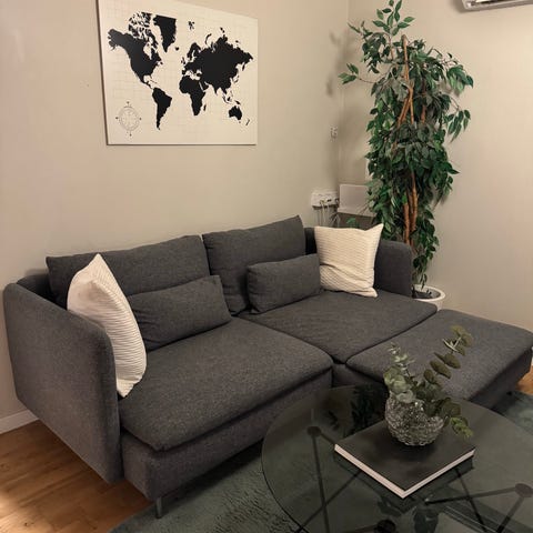 Fin bäddsoffa säljes pga. flytt. Den har stått i ett gästrum så är mycket varsamt använd. Soffan är två meter bred och utfälld är sängen 160cm bred. De mörka kuddarna ingår men de blå tänkte jag behålla. Finns i Saltsjö Boo, Nacka.