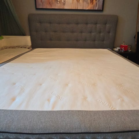 Viking Beds kontinentalsäng i ljusgrått tyg, 12 cm höga ben i kromad metall. Sängen består av två ramsängar med ben, en övre madrass och en bäddmadrass. Bäddmadrass medföljer om man vill, men den har fläckar på ena sidan men är fläckfri på den ena sidan (se sista 8 bilderna). I övrigt i fint skick. Övriga madrasserna är i fint skick (inga fläckar, hål/skador).