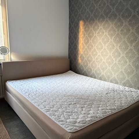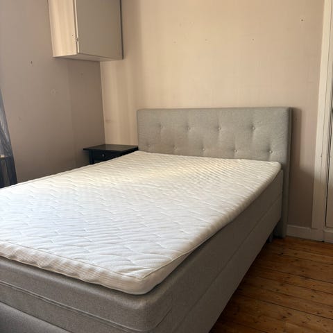 Viking Beds kontinentalsäng i ljusgrått tyg, 12 cm höga ben i kromad metall. Sängen består av två ramsängar med ben, en övre madrass och en bäddmadrass. Bäddmadrass medföljer om man vill, men den har fläckar på ena sidan men är fläckfri på den ena sidan (se sista 8 bilderna). I övrigt i fint skick. Övriga madrasserna är i fint skick (inga fläckar, hål/skador). Från ett rök- och djurfritt hem.