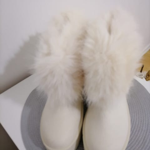Ett par tofflor i en ljusblå nyans med fuskpälsdetaljer runt öppningen. Skorna har en platt sula med räfflat mönster för bättre grepp. En etikett med texten ”LINEAR OF SWEDEN ESTABLISHED 2011” är fäst på baksidan av tofflorna.