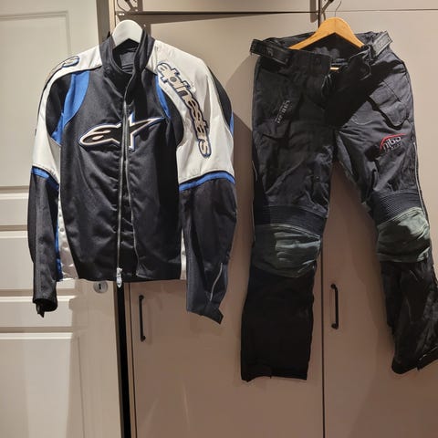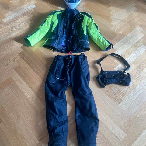 Richa mc-ställ bestående av jacka och byxa i svart färg till barn.Stället är avsett för motorcykelkörning och har reflexdetaljer på både jacka och byxa för ökad synlighet. Jackan har dragkedja framtill och hög krage. Byxorna har knäppning i midjan. Passar som skyddande ytterplagg vid körning i varierande väderförhållanden.
