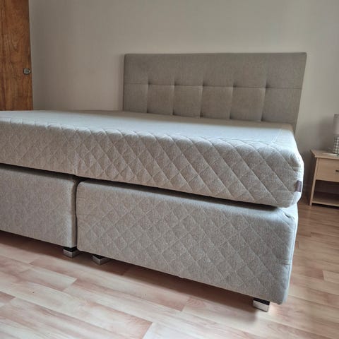 KungSängen säng i grått tyg. Påkostad för 8 år sedan (24.000kr) ena sidan mjukare andra sidan mer fast.