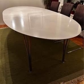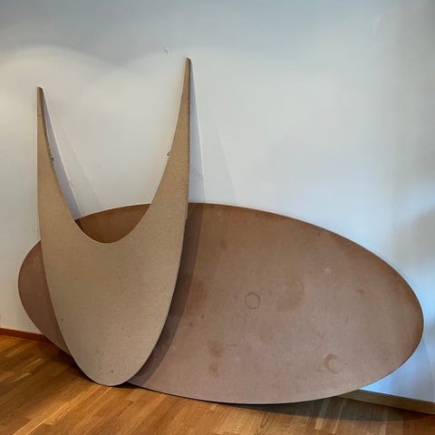 Gammal ellipsformad bordskiva från IKEA med hemmagjord förlängning bortskänkes. Se separat annons.