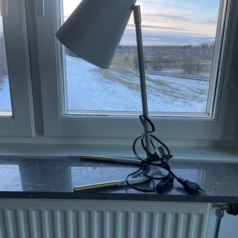 Riktbar skrivbordslampa. Lampan står på en stadig fot och kan riktas till önskat läge.