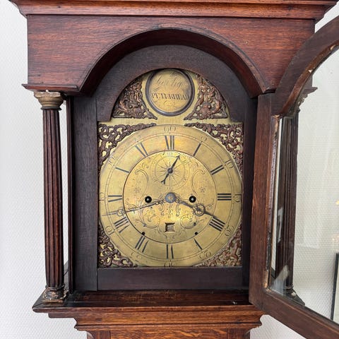 Golvur i trä med pendelverk. Uret har brun träholk med svängd form och öppningsbar frontlucka som ger åtkomst till pendel och vikter. Urskivan har arabiska siffror och två visare. Passar som golvstående klocka i exempelvis vardagsrum eller hall. Säljes av dödsbo. Hämtas på Östermalm torsdag 5/3 efter ö.k om tid