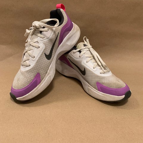 Nike träningssko i storlek 35. Skon är rosa med vit sula och har en tydlig Nike-logotyp på sidan. Ovandelen är i textil och syntet med elastiskt band över foten för att hålla skon på plats. Modellen är avsedd för träning och vardagsbruk och passar för barn med skostorlek 35. Plockas upp på södermalm
