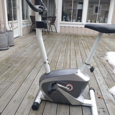 Air bike, remdriven som behöver lite kärlek. En skruv till ena vevarmen är borta, batterier behöver bytas i displayen och en fotpinne saknas.