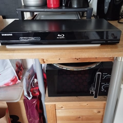 Samsung Blu-ray-spelare i svart utförande. Enheten är avsedd för uppspelning av Blu-ray-skivor samt kompatibla DVD- och CD-skivor (beroende på modellens specifikationer). På baksidan finns anslutningar för ström, digital ljudutgång (koaxial) samt ytterligare portar enligt märkning. Passar för anslutning till TV eller hemmabiosystem för uppspelning av film och ljud från fysiska skivor. Fjärrkontroll inkluderar.