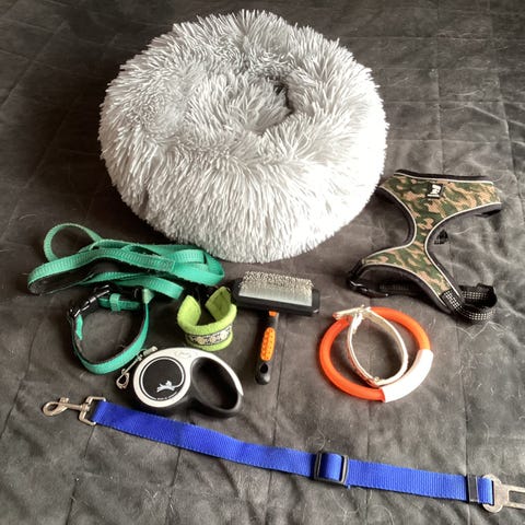 Hundkläder i form av täckande overaller för mindre hund. Har använts av Kinesiska nakenhundar. Plaggen är i mjukt material, bl.a. fleece eller liknande tyg, och täcker kropp, ben och hals. Flera olika färger och mönstrade banddetaljer syns på bilderna. Overallerna är fodrade och är avsedda att ge extra värme och skydd vid kyligare väder och kan användas vid promenader eller utomhusvistelse. Pris per plagg finns i beskrivningarna till bilderna. Köper du alla är priset 500 kr.