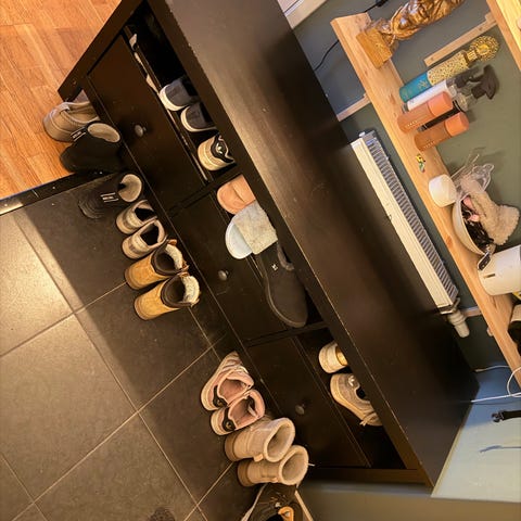 Bra förvaring med dörrar man skjuter uppåt .